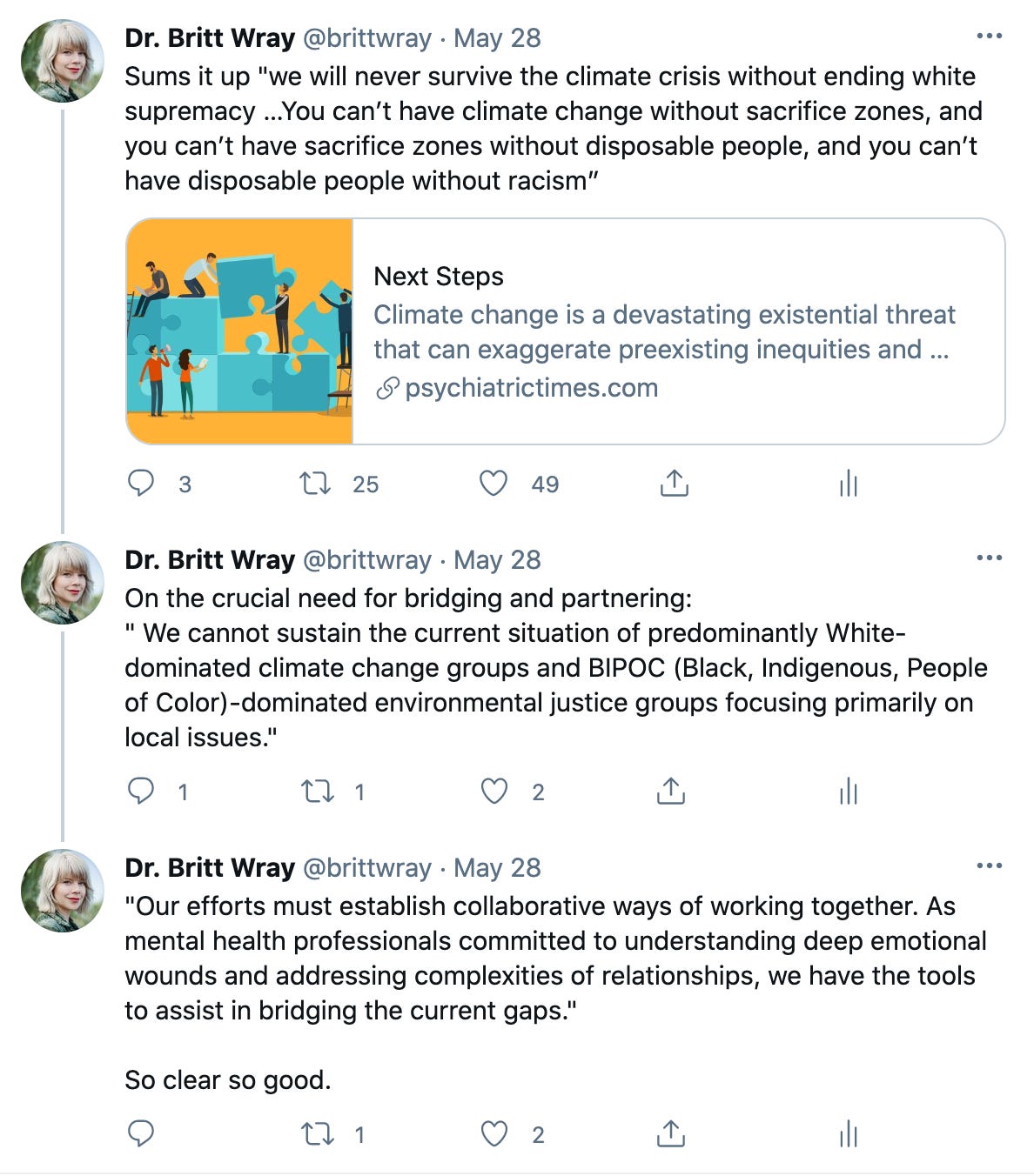 I want to flag this excellent article that came out last week in the Psychiatric Times which argues that psychiatrists have a crucial role to play in addressing the interconnected issues of racism, climate change, and mental health. Here’s what I tweeted about it. It’s well worth a read (as is the entire series on racism and climate change that this article capped off).